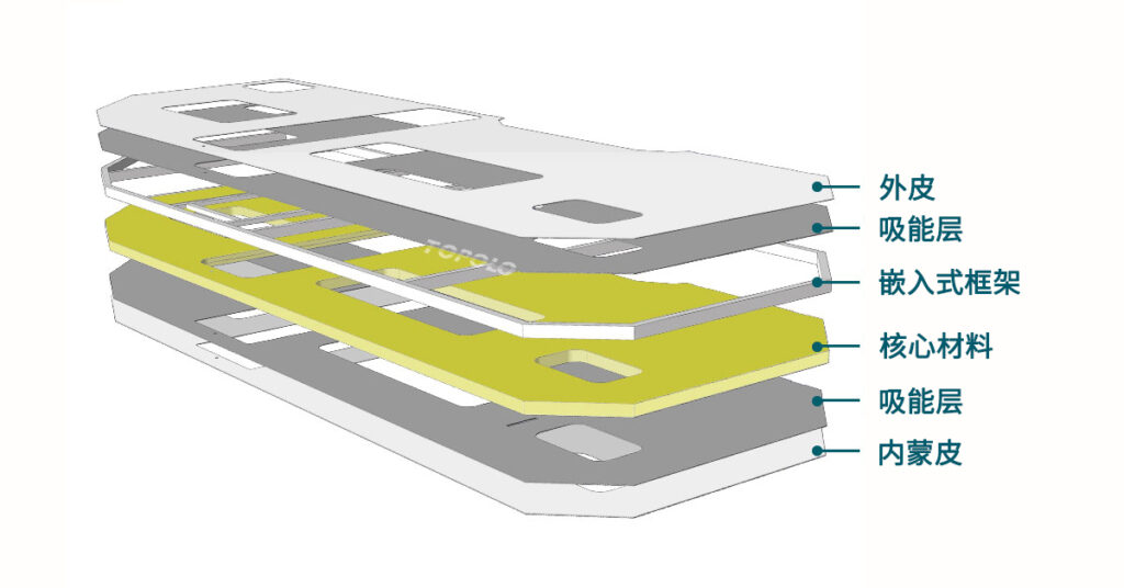 仅依赖玻璃纤维板和芯材的夹芯板结构无法提供更强的强度支撑。这在泡沫芯玻璃纤维夹芯板中更为明显。拥有更坚固的面板意味着添加更坚固的材料。通常我们会为夹芯板做一个“骨架”,嵌入泡沫芯中。这些材料通常是防水木材、高密度泡沫、铝型材、玻璃纤维型材等。还有一点是,我们将在芯材和表皮之间增加一层吸能材料,这不仅增加了面板的强度,还提高了表面的光滑度。