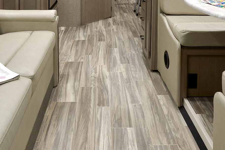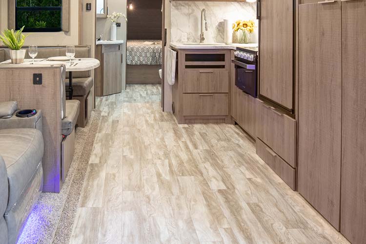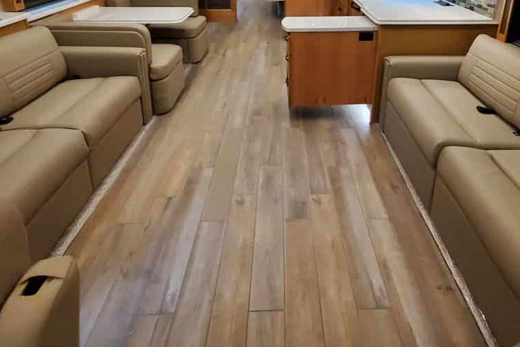 • 乙烯基皮革:柔软且表面光滑。它不仅提供舒适的脚感,而且非常容易清洁。它的质地丰富多样,你可以选择符合你房车风格的地板质地。