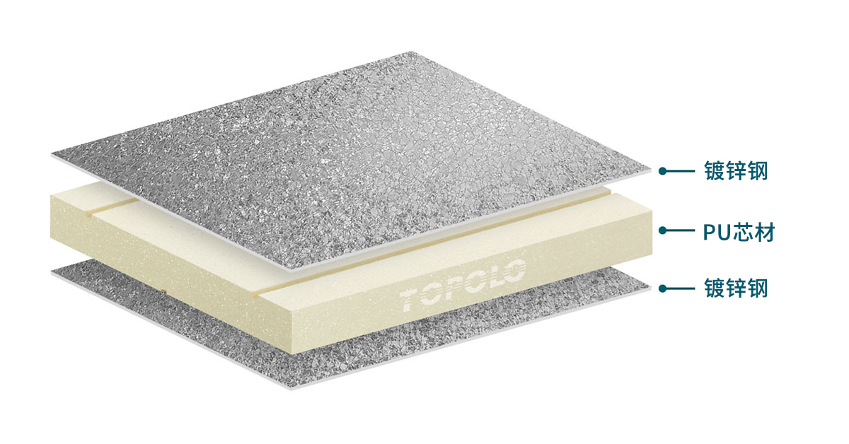 聚氨酯(PU)泡沫与预涂漆镀锌钢板的结合,使这些面板在保持温度控制、抵抗环境因素并保持结构完整性方面具有高效效能。它们常用于需要热绝缘的场合,如墙体、屋顶和冷藏设施的建造。如: